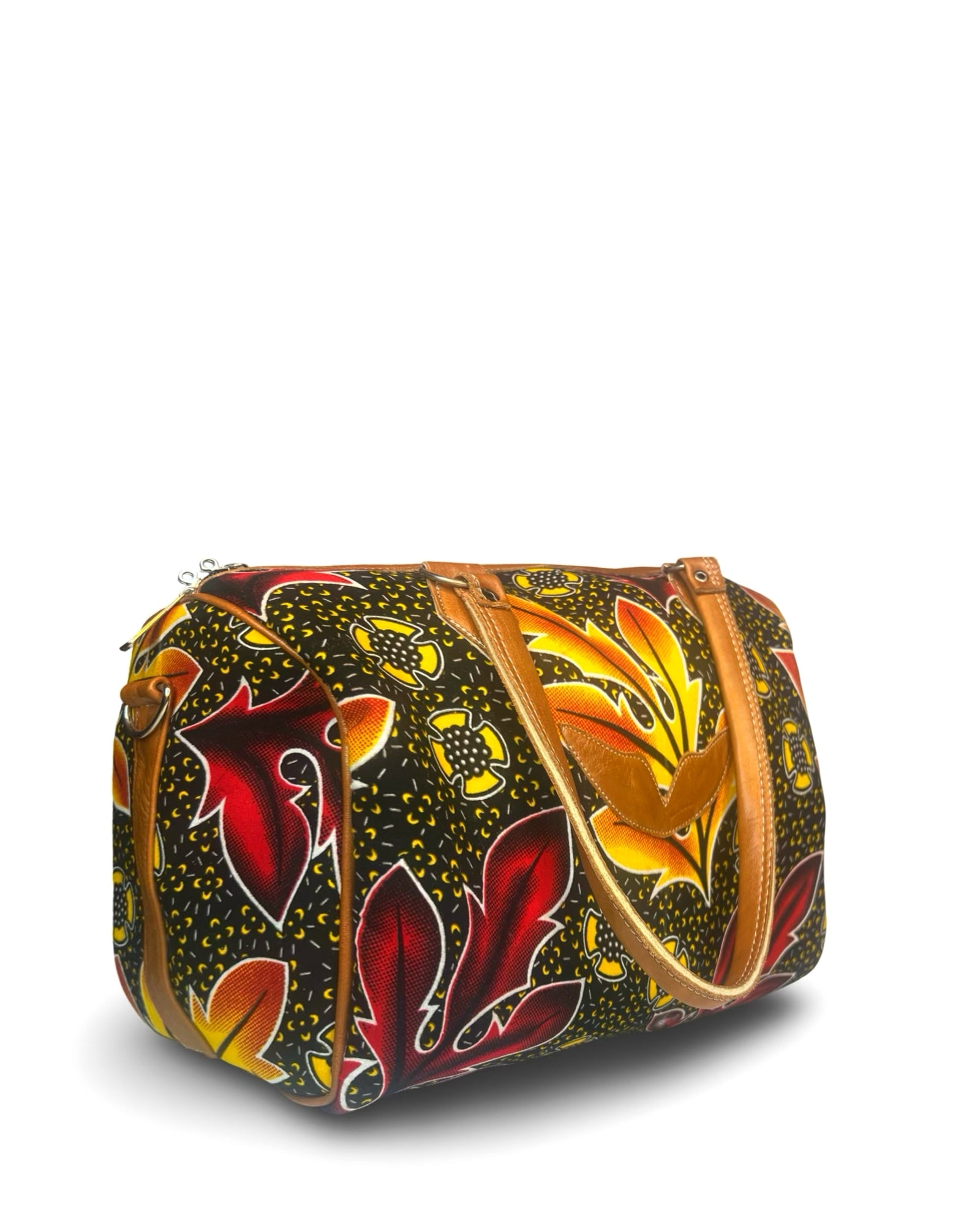The Afi Duffle is a bold, multifunctional bag that blends everyday ease with standout design. Its structured duffle shape provides generous space for your essentials without feeling bulky. The vibrant wax print base is covered in red, yellow, and orange leaf motifs, layered over a deep black background with golden detailing. Red leather trims add contrast and durability. Finished with reinforced handles and a secure zip closure, this bag is built for movement, whether you're heading to work, brunch, the gym, or an overnight stay. It's functional, fashionable, and made to be seen.