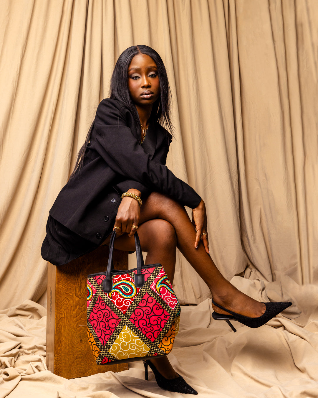 The Korkor Bag is a structured mid-size statement handbag made with a bold Ankara print in a diamond patchwork design. It features a striking color mix including pink, red, mustard, orange, and teal, balanced by black leather handles for a clean finished look. The firm body holds its shape upright and includes a zip closure to keep your items secure. Inside is a lined compartment with a slip pocket. This is not a subtle piece. It is built to stand out.